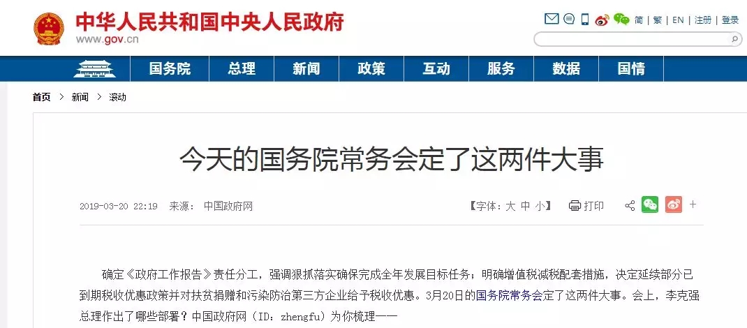 確定《政府工作報告》責任分工,強調狠抓落實確保完成全年發展目標任務;明確增值稅減稅配套措施,決定延續部分已到期稅收優惠政策并對扶貧捐贈和污染防治第三方企業給予稅收優惠。3月20日的國務院常務會定了這兩件大事。會上,李克強總理作出了哪些部署?中國政府網(ID:zhengfu)為你梳理──