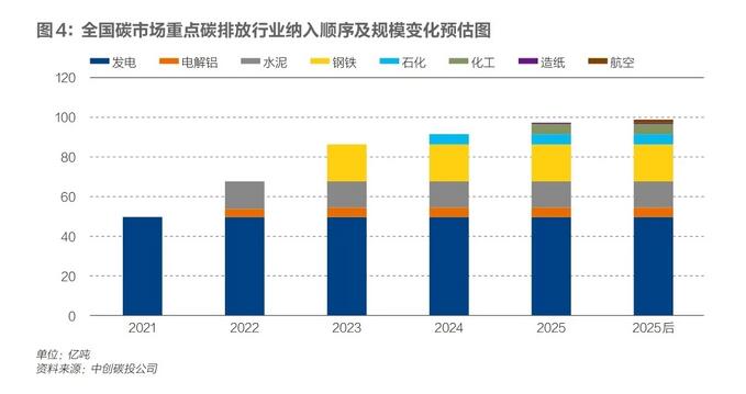 在碳市場(chǎng)涵蓋的范圍方面,未來(lái)以怎樣的節(jié)奏納入更多行業(yè),尚未明確。首個(gè)控排行業(yè)發(fā)電行業(yè)的碳排放總量約為40億噸,若電解鋁、水泥、鋼鐵、化工、造紙、石化、航空等七大高耗能行業(yè)全部納入全國(guó)碳市場(chǎng),碳排放總量預(yù)計(jì)在80億/年噸至100億噸/年之間。