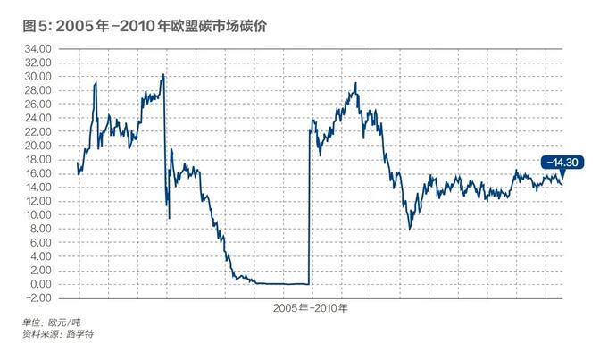 歐盟碳交易起始價(jià)較高,2005年初從15歐元/噸價(jià)位迅速上漲到28歐元/噸。但在2006年4月底,由于核查排放數(shù)據(jù)泄露,并顯示發(fā)放給成員國(guó)的碳配額總數(shù)遠(yuǎn)高于實(shí)際排放,碳配額嚴(yán)重過(guò)剩。導(dǎo)致每噸碳價(jià)從30歐元暴跌至10歐元。此后,由于配額不能存儲(chǔ)到下一階段導(dǎo)致碳價(jià)繼續(xù)暴跌,到2007年底接近零。