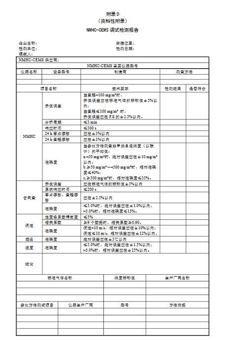 9.3.3驗收報告技術指標驗收測試報告應包括以下信息:a)報告標識-編號;b)檢測日期和編制報告日期;c)NMHC-CEMS標識-制造單位、型號和系列編號;d)包括在系統中的NMHC-CEMS的主要組件(如氣體檢測器、流速CMS等);e)安裝NMHC-CEMS的企業名稱和安裝位置相關污染源名稱;f)環境條件記錄情況(大氣壓力、環境溫度、環境濕度);g)示值誤差、分析周期、系統響應時間、零點漂移和量程漂移驗收引用的標準及技術指標要求;h)準確度驗收引用的標準及技術指標要求;i)可溯源到國家標準的標準氣體;j)參比方法所用的主要設備、儀器等;k)檢測結果和結論;l)測試單位;m)三級審核簽字;n)色譜分析儀出廠檢測原始譜圖復印件;o)驗收測試結果和驗收測試報告,格式參照HJ75附錄F;7p)備注(技術驗收單位認為與評估NMHC-CEMS性能相關的其他信息)。技術指標驗收完成后編制技術指標驗收報告,技術指標驗收結果應達到本標準表1的要求。